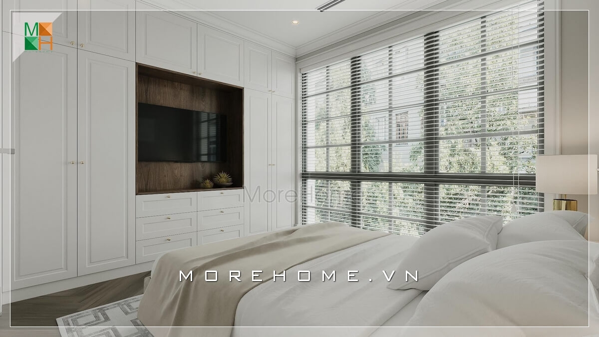Sắp xếp phòng ngủ đẹp, thông thoáng bởi cửa sổ 2 bên từ kính cường lực cùng rèm che chắn.