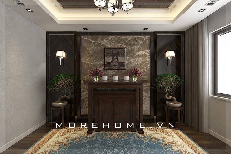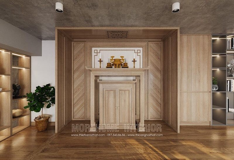 Vị trí bàn thờ chung cư, tủ thờ chung cư được thiết kế và thi công liền kề với không gian phòng khách. Morehome thi công hoàn thiện bàn thờ gia tiên hiện đại bằng gỗ tần bì nhập khẩu phun sơn màu cánh gián đẹp cho căn hộ chung cư Thăng Long Number One tại hà nội