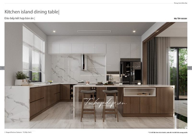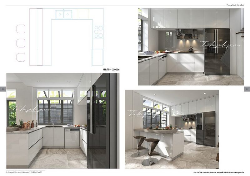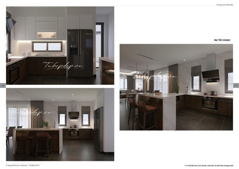 Mẫu thiết kế phòng bếp biệt thự, nhà phố hiện đại kết hợp tủ bếp chữ U và chữ I thông minh, tiết kiệm không gian.