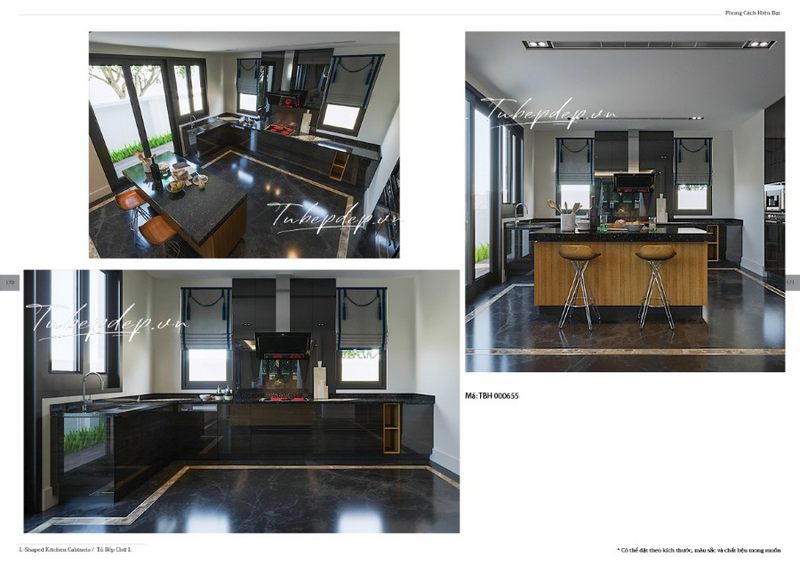Tủ bếp chữ L được sử dụng không chỉ cất trữ đồ đạc mà còn được thiết kế như một cách ngăn chia bao chọn không gian phòng bếp của biệt thự, nhà phố