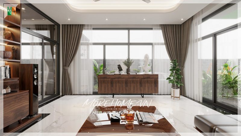 Kính ngăn thoáng đãng và sự gần gũi với thiên nhiên được sử dụng hoàn toàn trong thiết kế phòng khách biệt thự và nhà phố, cùng với sân vườn để tạo nên một không gian sống thoải mái.